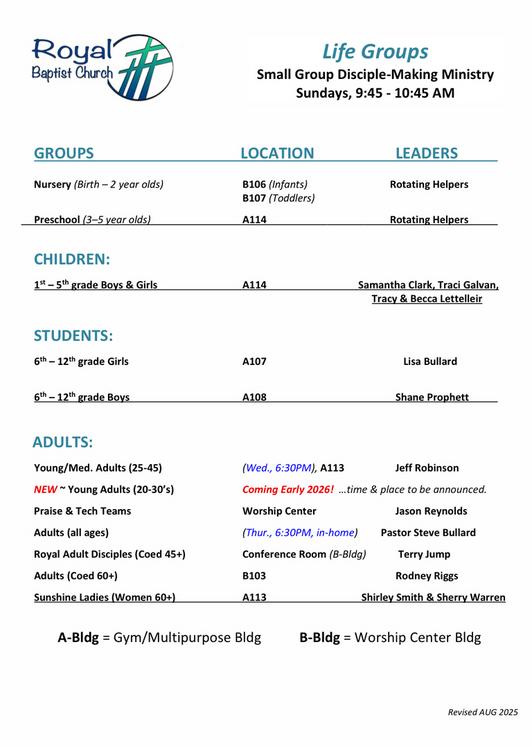 Everyone is encouraged to actively participate in a Life Group!  This is where you will meet people and make meaningful friendships.  Please see the Life Group listing below, get connected, and start building relationships for doing life together.
